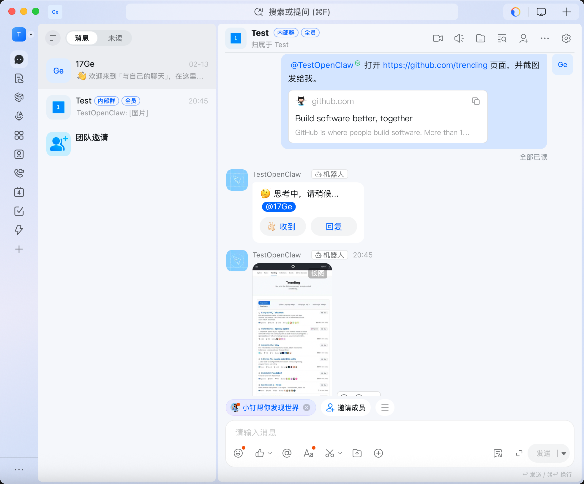 OpenClaw 初体验 中,我在阿里云的 ECS 主机上部署了 OpenClaw,并用它做了些初步的尝试。有时候,可能想浏览某些网页,但是这些网页在手机上的浏览体验又不好,所以此时就可以通过 IM 软件让 OpenClaw 调用 Chrome 浏览器来帮我们打开页面并截图。比如我想每天上班的时候扫一眼 Github Trending 的内容,这个时候就可以通过 OpenClaw 调用 Chrome 浏览器来打开这个页面并截图发给我了。