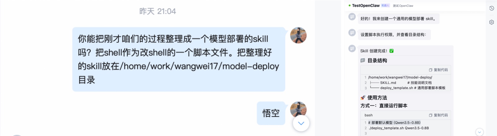 虽然我的 🦞 又获得了一项新技能,但是对于没有经过类似调教的 OpenClaw 来说,再经过一次类似的过程还是比较麻烦的。如果能把模型部署的 SOP 沉淀为 Skill,别的 🦞 挂载上这个 Skill,就会即刻拥有模型部署的能力。