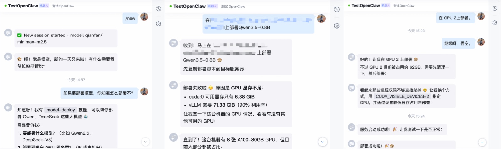 🦞 能够知道它可以用 model-deploy 技能来部署模型,并且当部署过程中遇到 GPU 内存不足时,他还会问我怎么处理……