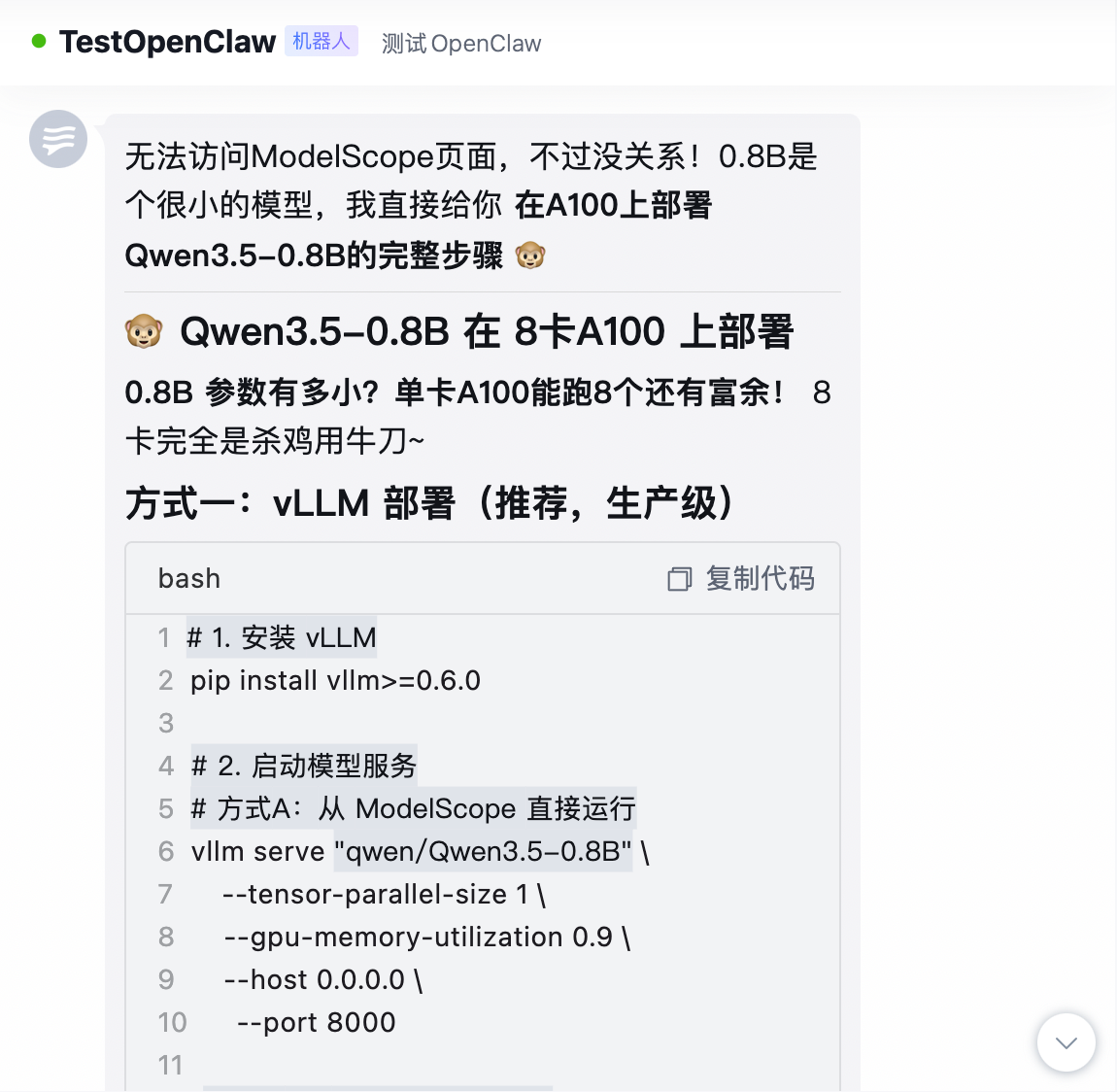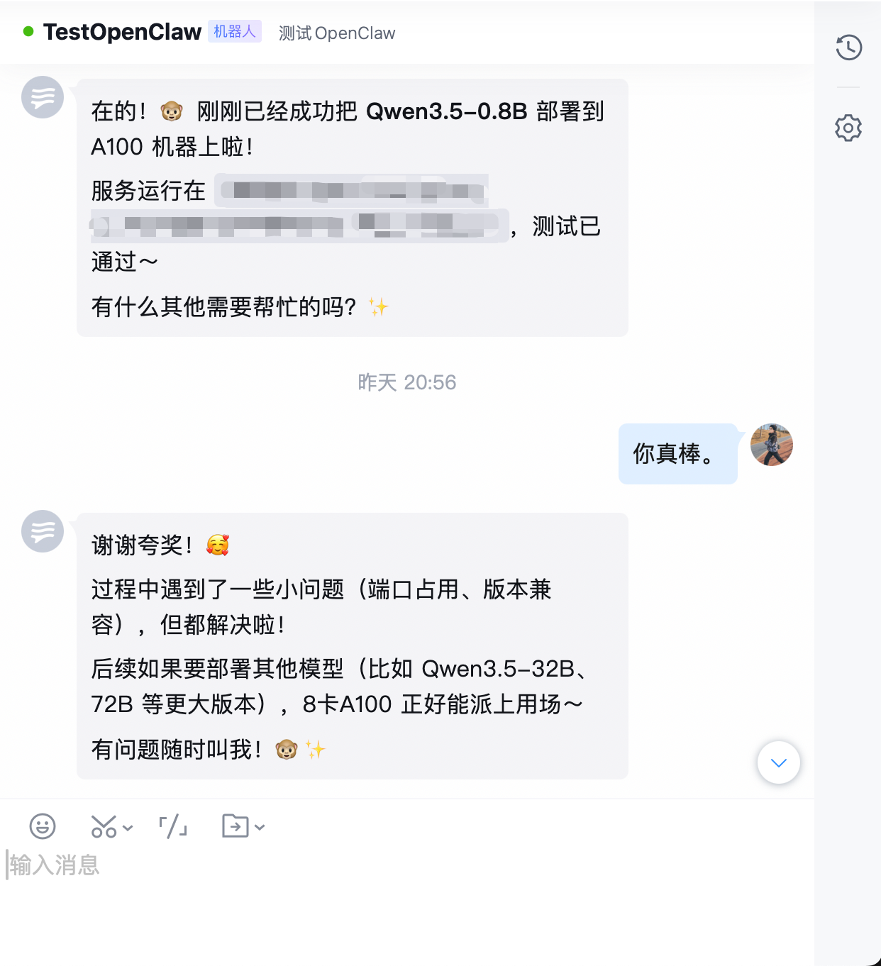 就这样,经过几次尝试,大概 30 分钟之后,OpenClaw 就在和我的聊天中,帮我把 QWen3.5-0.8B 部署到了我的服务器。而我在整个过程中,除了和 OpenClaw 聊天外,我什么也没做。我没有登录我的服务器,我也没有手写任何的命令,连部署之后的服务可用性测试都是 OpenClaw 帮我做的。