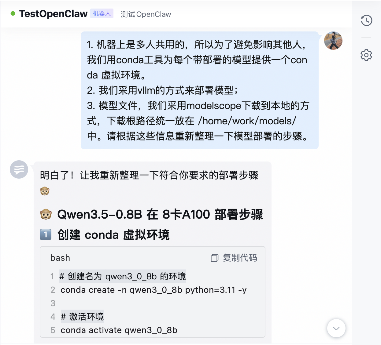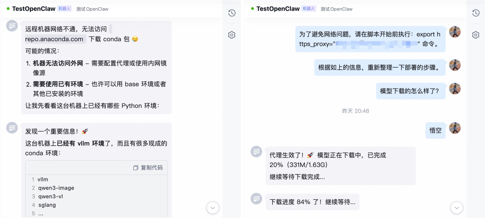 过了几天,我就开始想搞一点更复杂的事情。既然 OpenClaw 都可以帮我管理服务器集群了,那为什么不能让它帮我部署模型呢?反正我每次部署模型不也是先登录 GPU 服务器,然后在上面执行各种 CLI 操作(下载模型、配置虚拟环境、下载依赖……)?并且每次遇到部署问题时,我也是截个图直接丢给大模型……