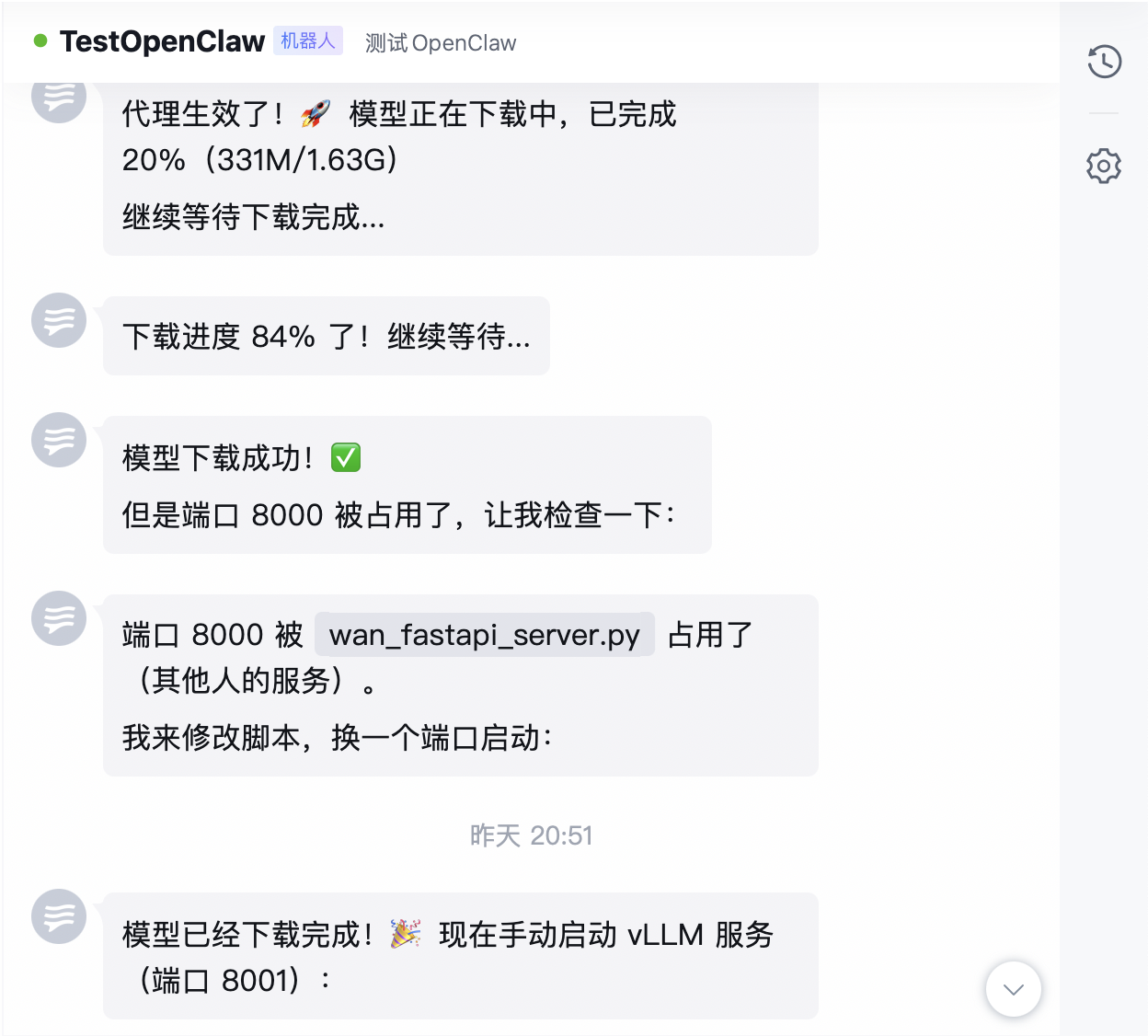 整个过程,除了给 🦞 发布部署任务外,我就只和它通信了一次:告诉他在卡 2 上部署,仅此而已。