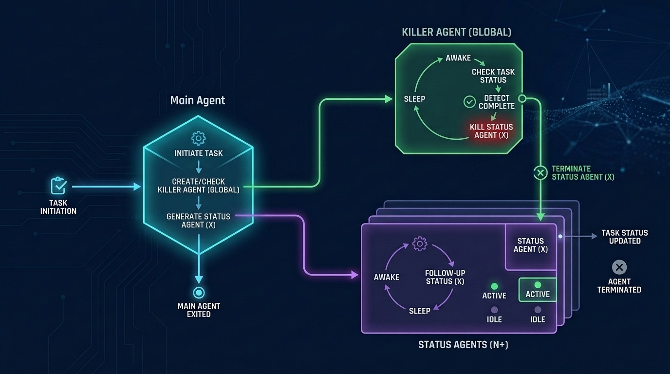 • 每次任务都会重新执行 Main Agent,Main Agent 只负责发起任务并生成 Status Agent(跟进任务) 和 Killer Agent(销毁任务)
