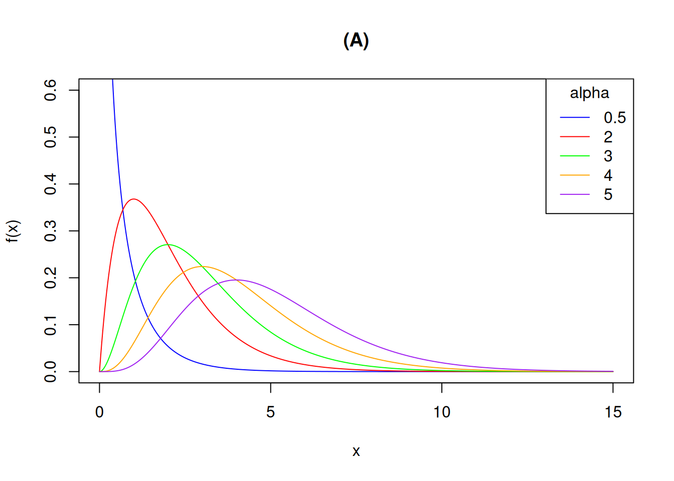 由于自由度为 \(n\) 的卡方分布与参数 \(\alpha = n/2\) 且 \(\lambda = 1/2\) 的伽马分布相同,由此根据 方程式 5.35 和 方程式 5.36 得出服从该分布的随机变量 \(X\) 的均值和方差为: