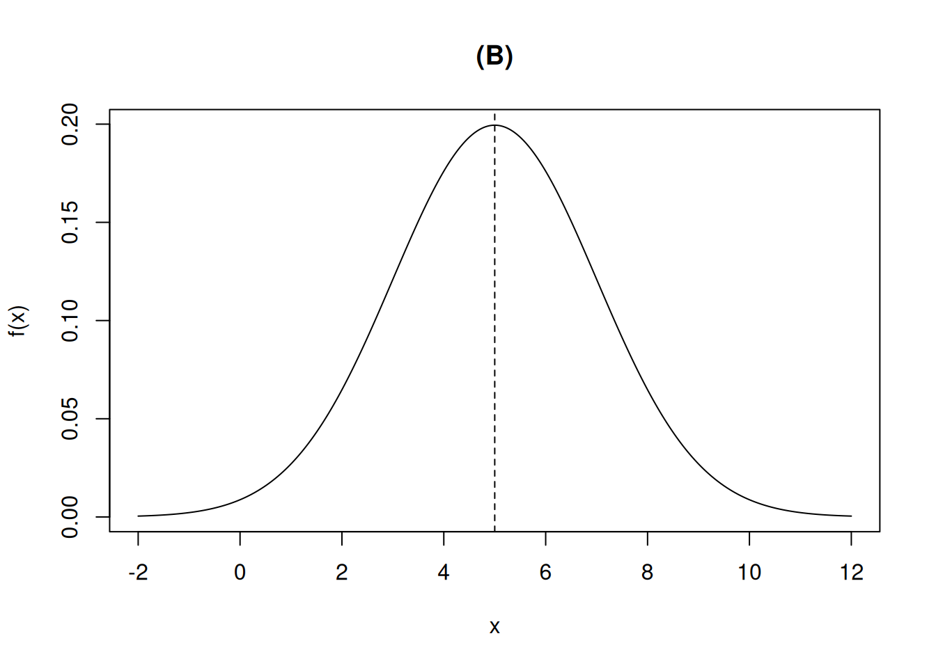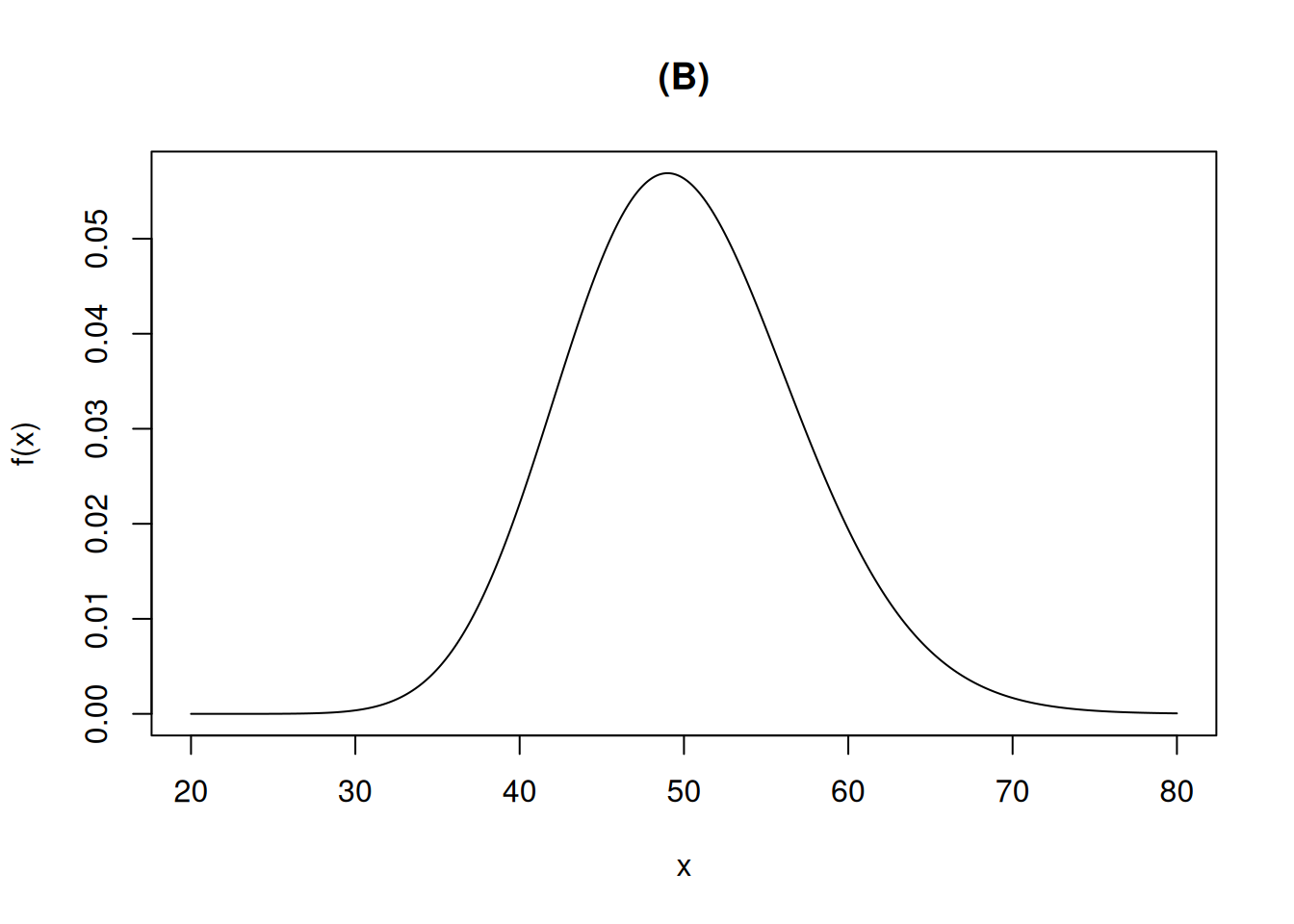 plot(x2, dgamma(x2, 50, 1), type = "l", xlab = "x", ylab = "f(x)", main = "(B)")