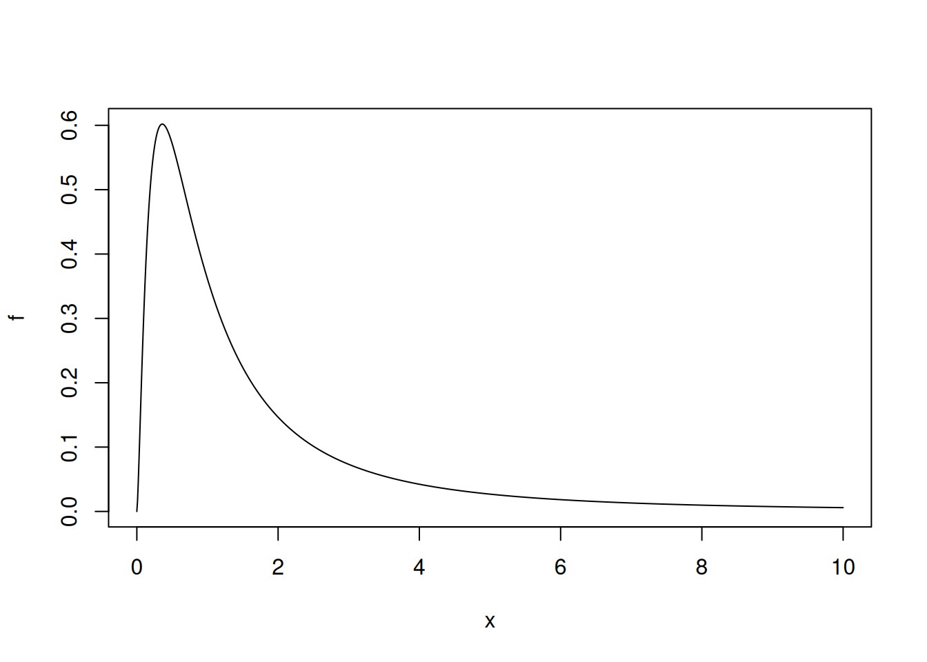 我们认出这是参数为 \((n/2, 1/2)\) 的伽马随机变量的矩母函数。因此,根据矩母函数的唯一性,得出这两个分布——自由度为 \(n\) 的卡方分布和参数为 \(n/2\) 及 \(1/2\) 的伽马分布——是相同的,因此我们可以得出结论,\(X\) 的密度由下式给出: