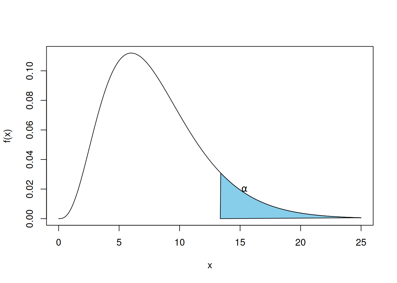 如果 \(X\) 是自由度为 \(n\) 的卡方随机变量,那么对于任何 \(\alpha \in (0, 1)\),数量 \(\chi_{\alpha, n}^2\) 定义如下: