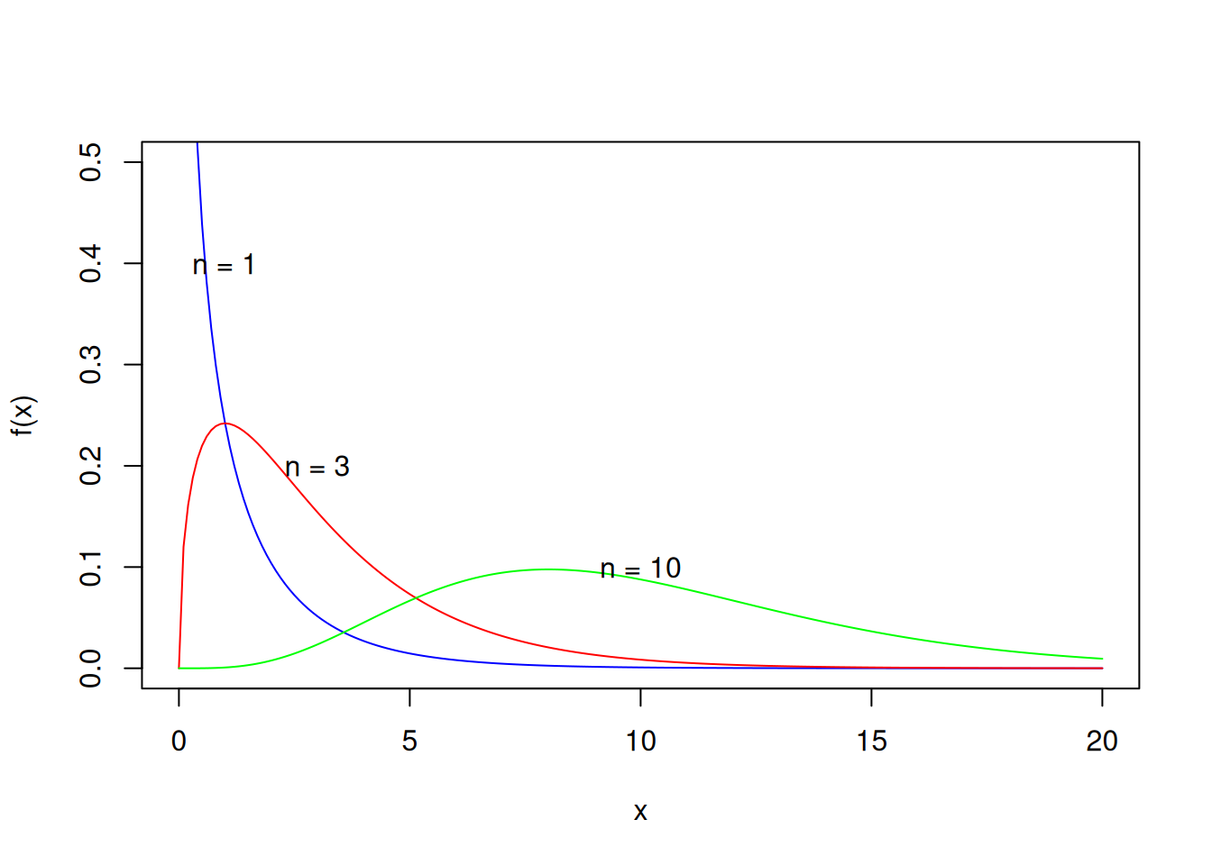 被称为服从自由度为 \(n\) 的卡方分布(chi-square distribution)。我们将使用符号: