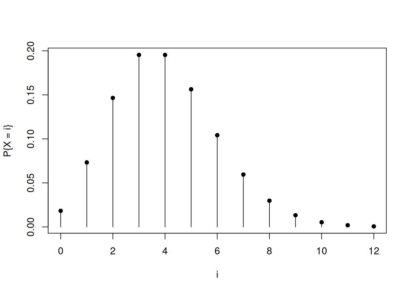 我们还可以使用 R 来绘制二项随机变量的概率图。假设 \(X\) 是一个参数为 \((10, 4)\) 的二项随机变量,并且我们想要绘制 \(P(X=i), i=1...10\) 的概率图。我们可以使用如下的代码:
