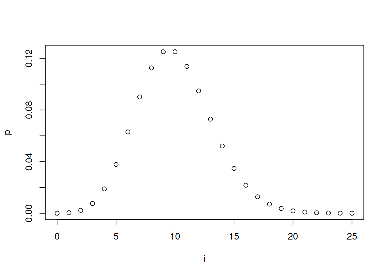 在 R 中,如果想得到参数为 \((n,p)\) 的二项随机变量成功 \(i\) 次的概率,则可以输入: